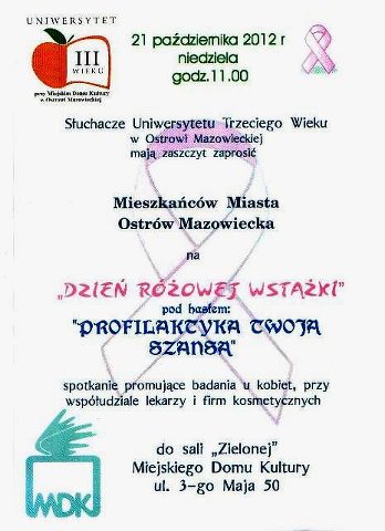 Słuchacze Uniwersytetu Trzeciego Wieku zapraszają 21 października br. o godzinie 11.00 na spotkanie promujące badania u kobiet związane z profilaktyką raka piersi pod hasłem "Profilaktyka twoją szansą". Spotkanie odbędzie się przy współudziale lekarzy i firm kosmetycznych w ramach Dnia Różowej Wstążki w zielonej sali w budynku MDK przy ul. 3 Maja 50.
