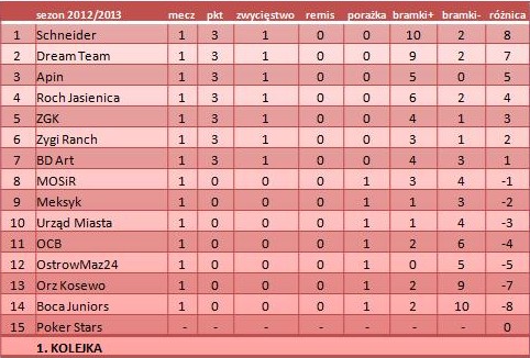 Najlepiej spośród całej stawki zaprezentował się Schneider, który zwyciężył z Boca Juniors 10:2 i objął prowadzenie w lidze. Dobre spotkanie rozegrał także inny z faworytów Dream Team. Zwycięzca letniej edycji pokonał Orz Kosewo 9:2 i po pierwszej kolejce plasuje się tuż za Schneiderem.