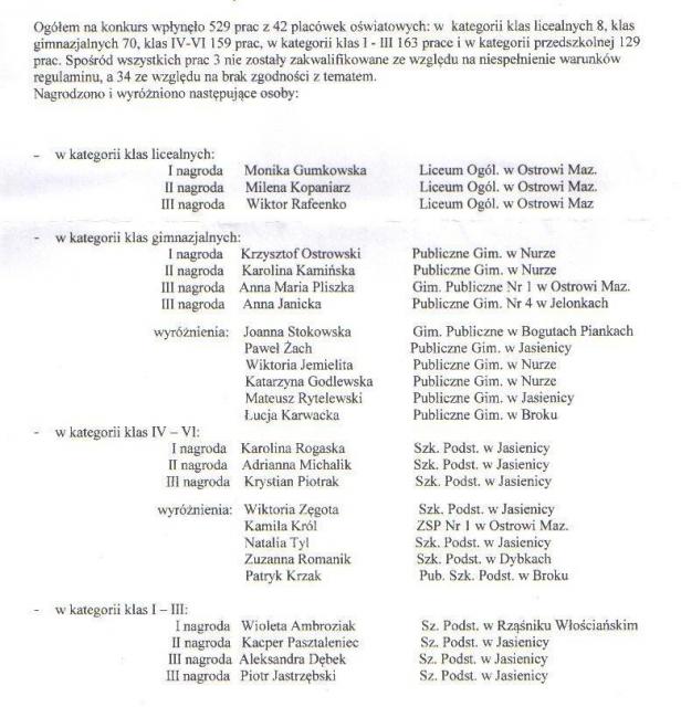 Pierwsze miejsce w kategorii klas licealnych otrzymała Monika Gumkowska z Liceum Ogólnokształcącego im. Mikołaja Kopernika, w kategorii klas gimnazjalnych zwyciężył Krzysztof Ostrowski z Publicznego Gimnazjum w Nurze, w kategorii klas IV-VI najlepszą okazała się Karolina Rogaska z szkoły w Jasienicy, klas I-III Wioleta Ambroziak ze szkoły w Rząśniku Włościańskim, a pierwszą nagrodę wśród przedszkolaków zdobyła Zuzanna Pietruczak z Miejskiego Przedszkola nr 3 w Ostrowi Mazowieckiej.