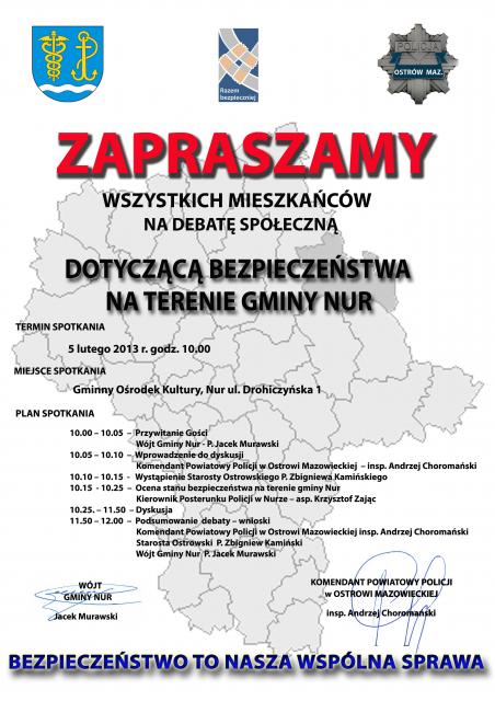 5 lutego o godz. 10:00 w Gminnym Ośrodku Kultury w Nurze odbędzie się debata społeczna na temat bezpieczeństwa mieszkańców gminy, w trakcie której zostaną przedstawione i omówione informacje dotyczące: