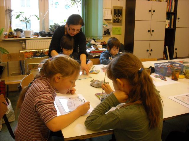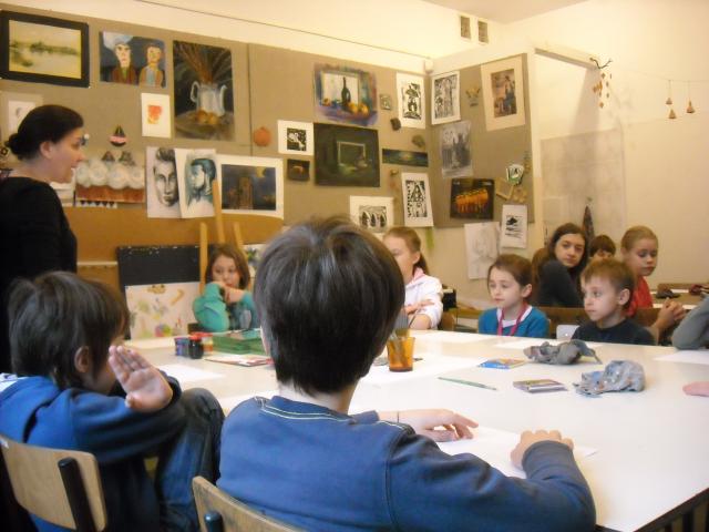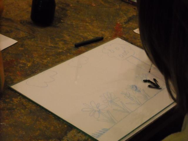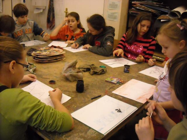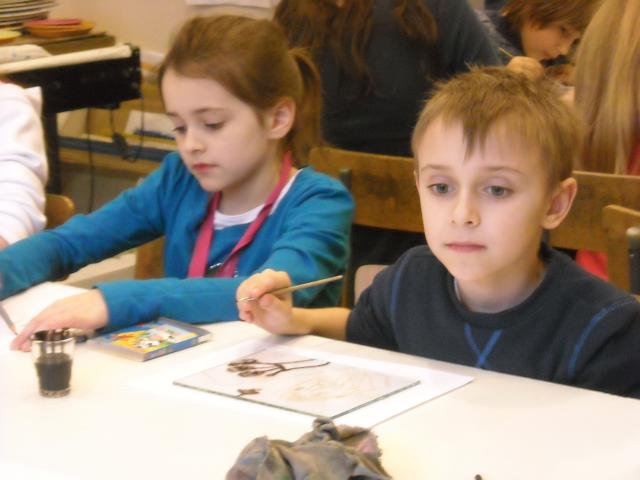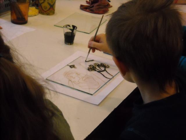 Temat prac był dowolny, dzieci na swoich szkicach rysowały kwiaty, zwierzęta i krajobrazy. Po narysowaniu konturów każdy uczeń dostał szybkę, na której rozpoczynał tworzenie poważnego i bardziej pracochłonnego dzieła. Na następnych zajęciach uczniowie będą kolorować swoje poniedziałkowe prace.