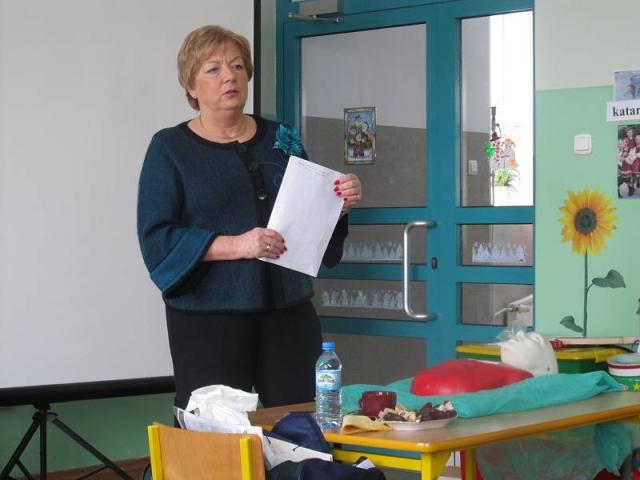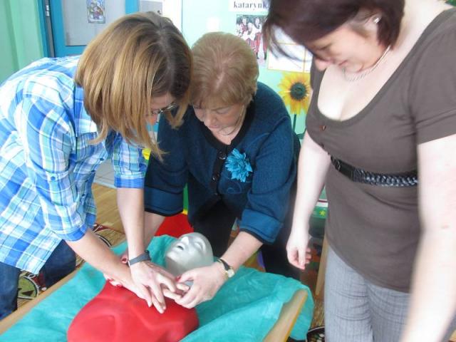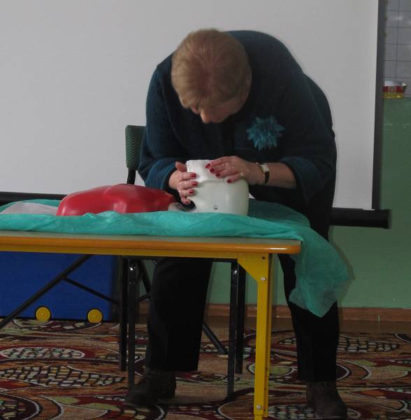 Wykładowca, Barbara Kittner, przypomniała o zasadach udzielania pierwszej pomocy w razie wypadku, przybliżyła także sposób postępowania w razie omdleń, krwawień z nosa, bólu w klatce piersiowej, oparzeń, odmrożeń czy ukąszenia owadów. Uczestnicy szkolenia mieli okazję praktycznego udziału w zajęciach przeprowadzając reanimację na fantomie.