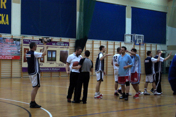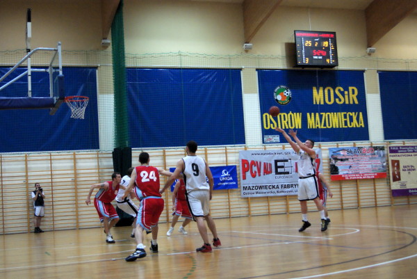 Pierwsze minuty meczu wyglądały bardzo dobrze. Grę prowadził Sokół i utrzymywał bezpieczny dystans punktowy od rywala. Gra toczyła się w bardzo dynamicznym tempie, więcej doświadczenia wykazywali zawodnicy z Ostrowi Mazowieckiej. Pierwsza kwarta zakończyła się zwycięstwem Sokoła 20:16. W drugiej kwarcie obraz gry niewiele się zmienił, w tej części meczu widać było jednak większą agresję co skutkowało niewielką ilością zdobytych punktów, gra obronna była wiodącym elementem po stronach obydwu drużyn. Mimo to Sokół zdobył kolejne punkty dystansując przeciwnika.