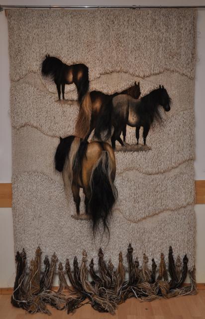 W twórczości artystki ważna była bliska współpraca z profesorem Ludwikiem Maciągiem, której efektem jest seria gobelinów o tematyce hippicznej. Część z nich można obejrzeć na wystawie w Miejskim Domu Kultury. Kolorytem gobelinów podobnie jak kolorami malarstwa można cieszyć oczy jedynie w bezpośrednim odbiorze. Oprócz płaskiej tradycyjnej techniki, artystka wykorzustuje sploty nadające tkaninie fakturę i przestrzenność.