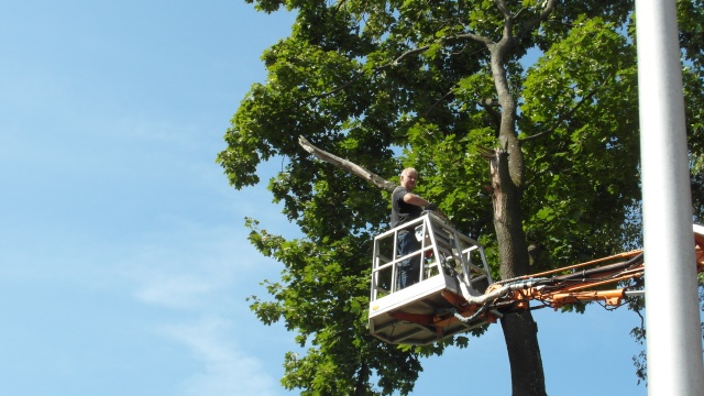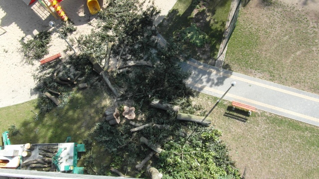 29 sierpnia br. w Ogródku Jordanowskim odgrodzono część placu. W tym miejscu, specjalistyczna firma, usuwała drzewo, które, po ocenie dendrologicznej, kwalifikowało się do jak najszybszego wycięcia. Korzystając z obecności sprzętu, usunięto również nadmiernie rozrośnięte konary, które ze względu na ciężar, mogłyby odłamać się i stanowić potencjalne niebezpieczeństwo.
