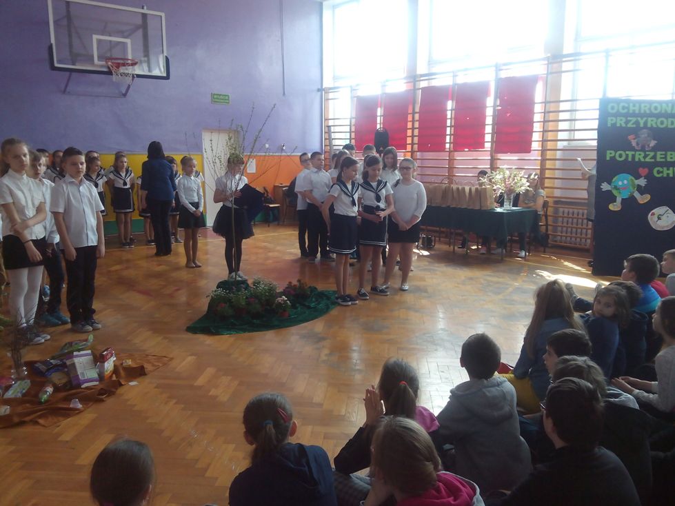 Podczas uroczystego apelu o tematyce ekologicznej można było podziwiać wystawę pięknych konkursowych dzieł plastycznych.
