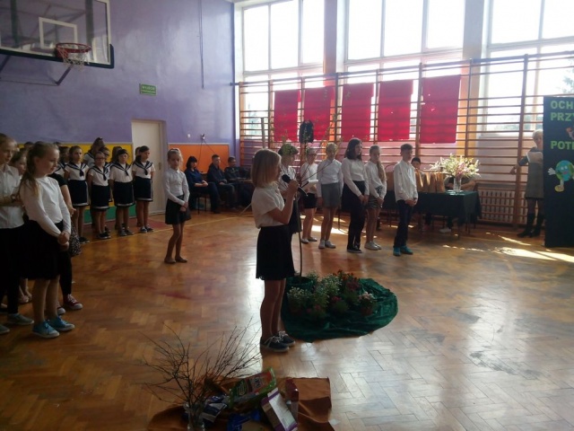 Podczas uroczystego apelu o tematyce ekologicznej można było podziwiać wystawę pięknych konkursowych dzieł plastycznych.