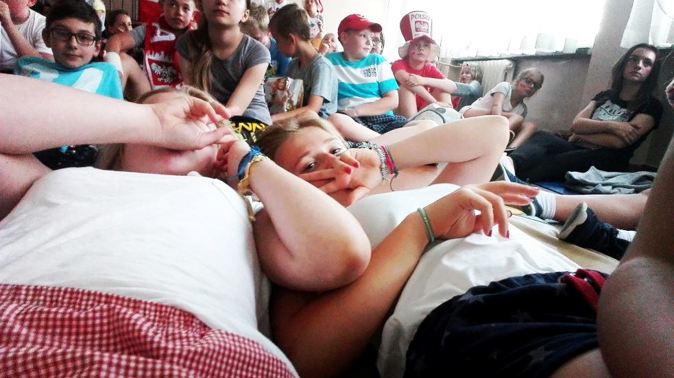 Uczniowie przyszli w kolorach biało-czerwonych, w flagami, trąbkami i gadżetami kibica.