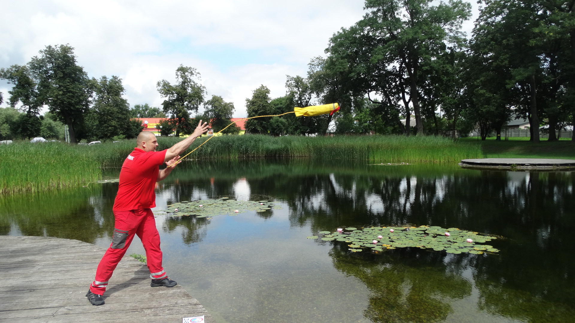 Dzielnicowi z powiatu ostrowskiego uczyli się dziś na stawie miejskim ratować tonącego przy użyciu "rzutki ratowniczej".