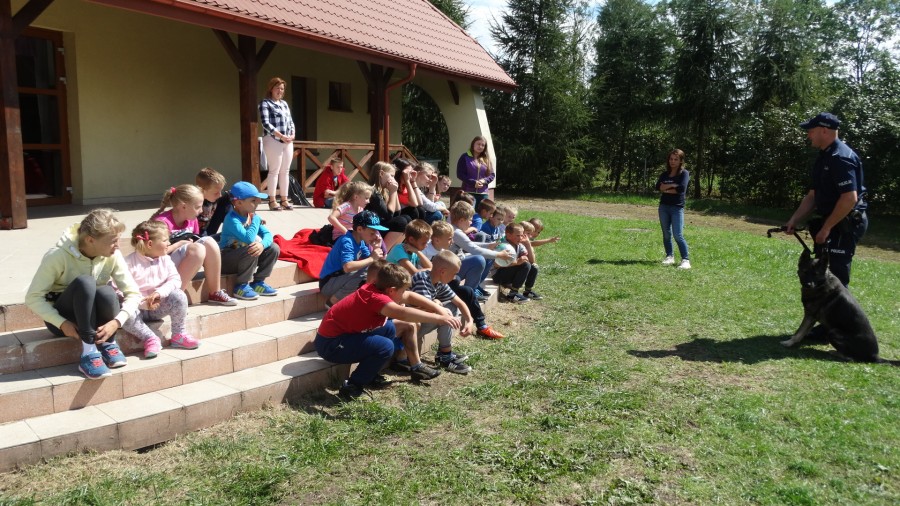 Dzieci odpoczywające na półkoloniach w OSP w Chmielewie odwiedzili funkcjonariusze ostrowskiej komendy z Andim - psem policyjnym.