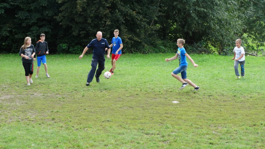 Dzieci odpoczywające na półkoloniach w OSP w Chmielewie odwiedzili funkcjonariusze ostrowskiej komendy z Andim - psem policyjnym.