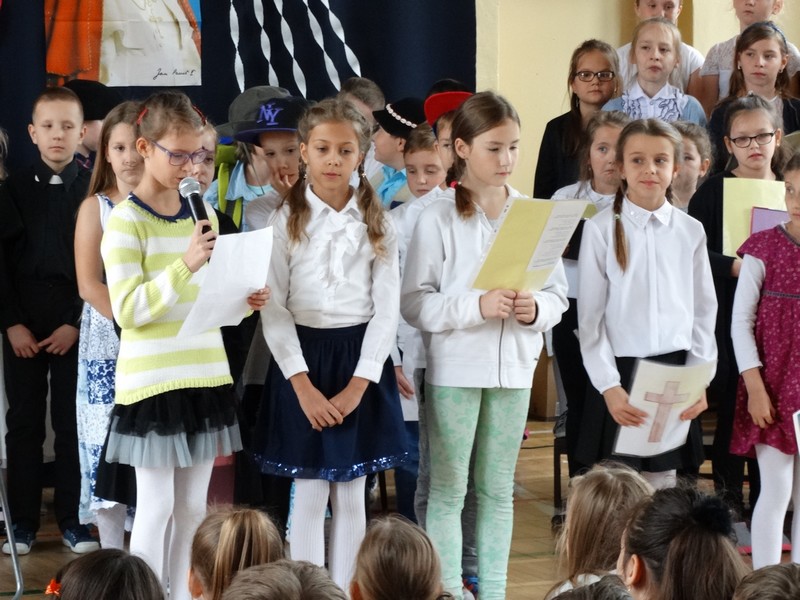 Klub Papieski pod kierunkiem p. Małgorzaty Ryszewskiej przybliżył społeczności uczniowskiej nauczanie św. Jana Pawła II o Bożym miłosierdziu oraz ukazał troskę Papieża, byśmy postawą bliskości i dobroci wobec bliźnich wypełniali Jego wezwanie "Bądźcie świadkami miłosierdzia!".
