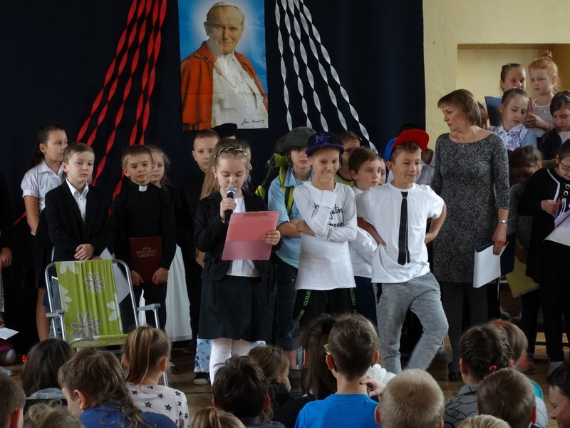 Klub Papieski pod kierunkiem p. Małgorzaty Ryszewskiej przybliżył społeczności uczniowskiej nauczanie św. Jana Pawła II o Bożym miłosierdziu oraz ukazał troskę Papieża, byśmy postawą bliskości i dobroci wobec bliźnich wypełniali Jego wezwanie "Bądźcie świadkami miłosierdzia!".
