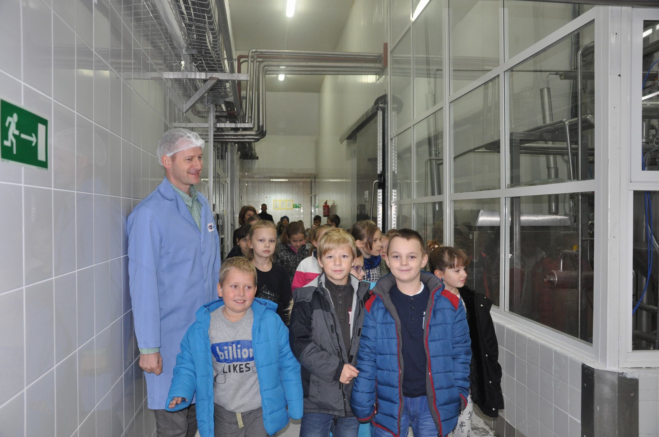 Dzieci przywitali a następnie oprowadzili po zakładzie: Dyrektor Produkcji pan Roman Podbielski, Specjalista ds. Jakości pani Joanna Nowacka, Technolog Tatiana Sirenko, Asystentka Zarządu pani Emilia Krawczyk-Bazylczuk.