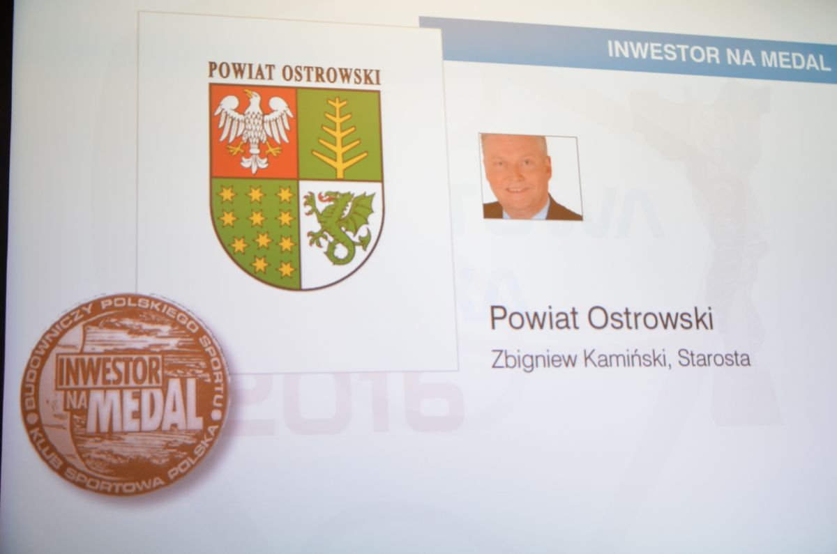 Starosta Ostrowski Zbigniew Kamiński otrzymał wyróżnienie Inwestor na Medal 2016 w konkursie "Budowniczy Polskiego Sportu".