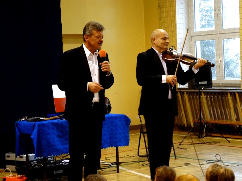 20 grudnia uczniowie i nauczyciele SP1 muzycznie powitali dzień szkolny, a to dzięki występowi muzyków duetu smyczkowego reprezentowanego przez Łódzkie Biuro Koncertowe "Wirtuoz".