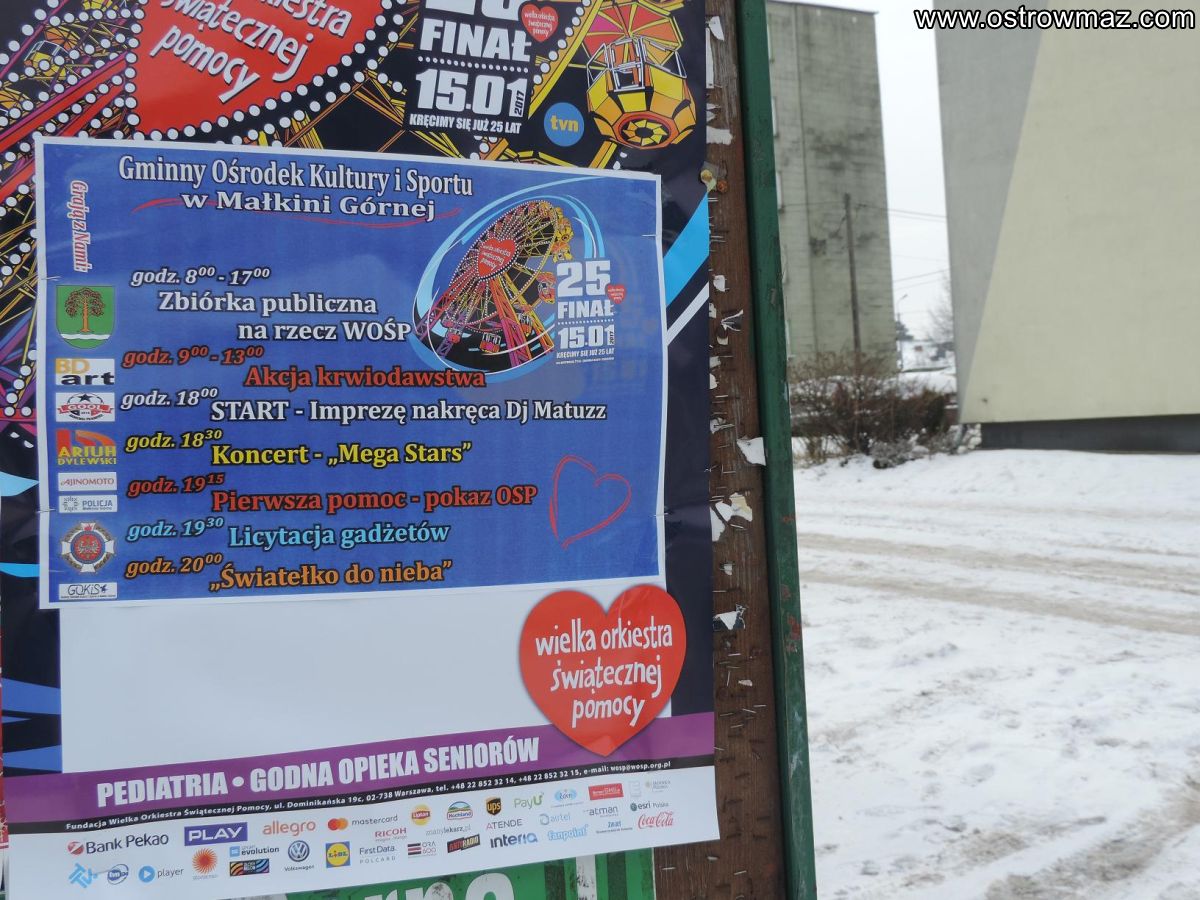 W niedzielę 15.01.2017 r. Wielka Orkiestra Świątecznej Pomocy zagrała po raz dwudziesty piąty. Jubileuszową zbiórkę dla ratowania życia i zdrowia dzieci na oddziałach ogólnopediatrycznych oraz dla zapewnienia godnej opieki medycznej seniorom mieszkańcy Małkini Górnej wsparli wyjątkowo hojnie.