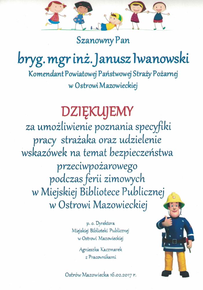 16 lutego w ramach akcji "Bezpieczne Ferie 2017" strażacy KP PSP Ostrów Mazowiecka gościli w komendzie dzieci spędzające ferie z Miejską Biblioteką Publiczną w Ostrowi Mazowieckiej. Wśród gości były również przedszkolaki z Miejskiego Przedszkola Nr 1 Ostrowi Mazowieckiej oraz podopieczni "Szlachetnej Paczki".