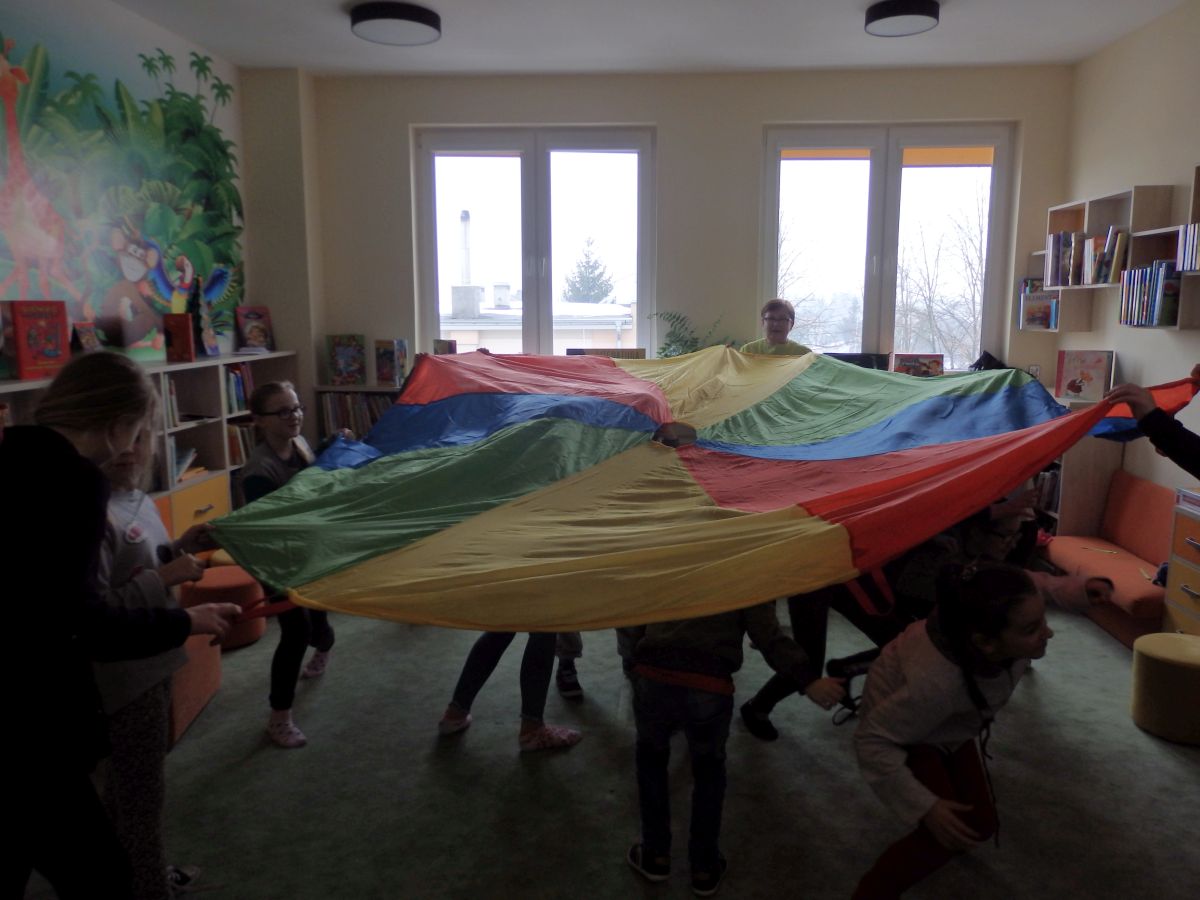 Podczas ferii dzieci uczestniczyły m.in. w zajęciach teatralnych, zabawach ruchowych przy muzyce z chustą animacyjną oraz zajęciach sportowych.