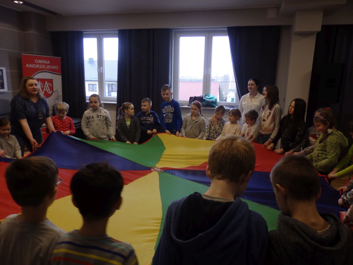 Podczas ferii dzieci uczestniczyły m.in. w zajęciach teatralnych, zabawach ruchowych przy muzyce z chustą animacyjną oraz zajęciach sportowych.