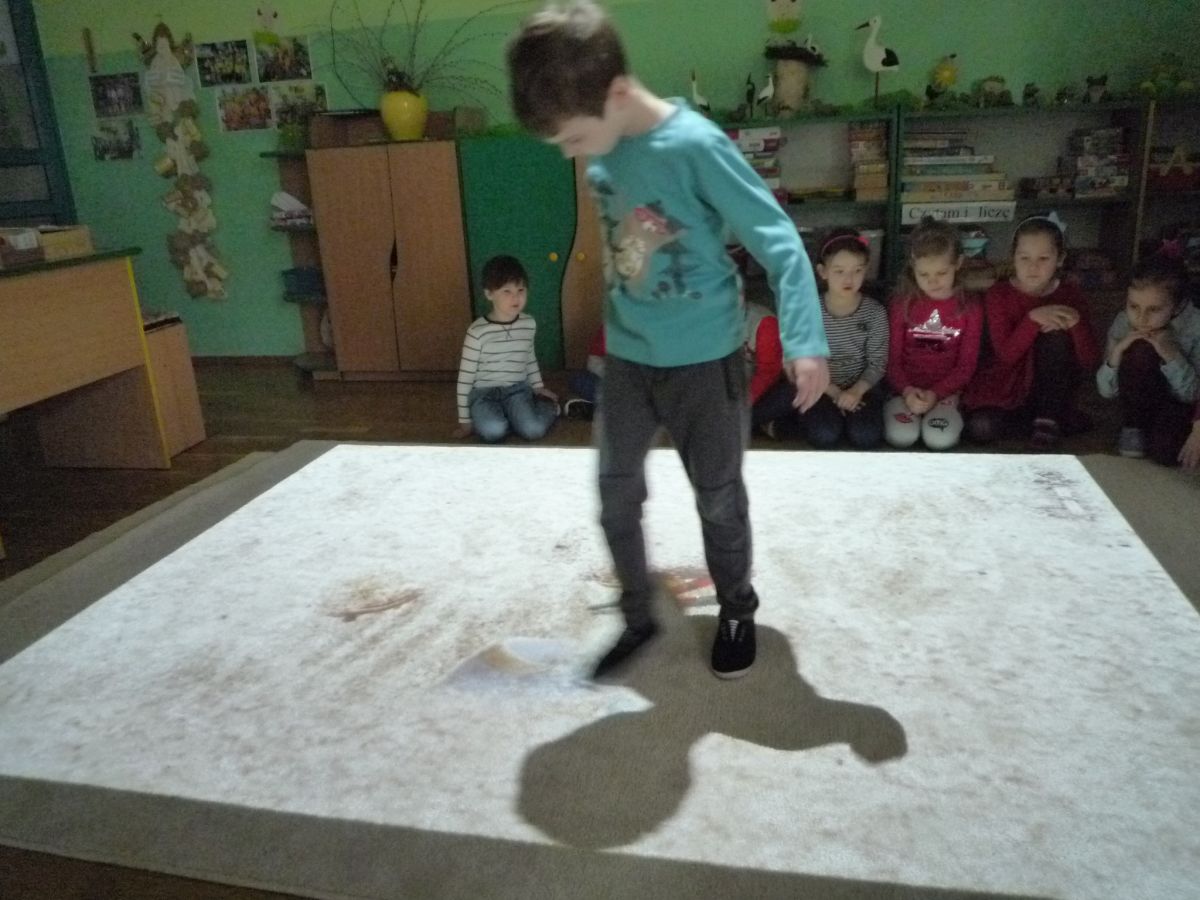 Dzieci z grupy 6-latków A i 4-latków A bardzo chętnie bawią się z wykorzystaniem interaktywnej podłogi FUN FLOOR.