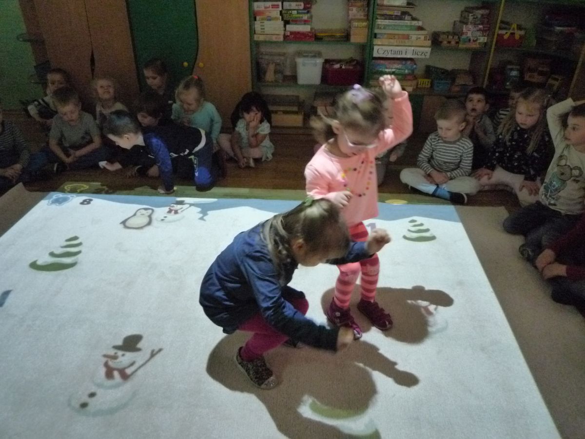 Dzieci z grupy 6-latków A i 4-latków A bardzo chętnie bawią się z wykorzystaniem interaktywnej podłogi FUN FLOOR.