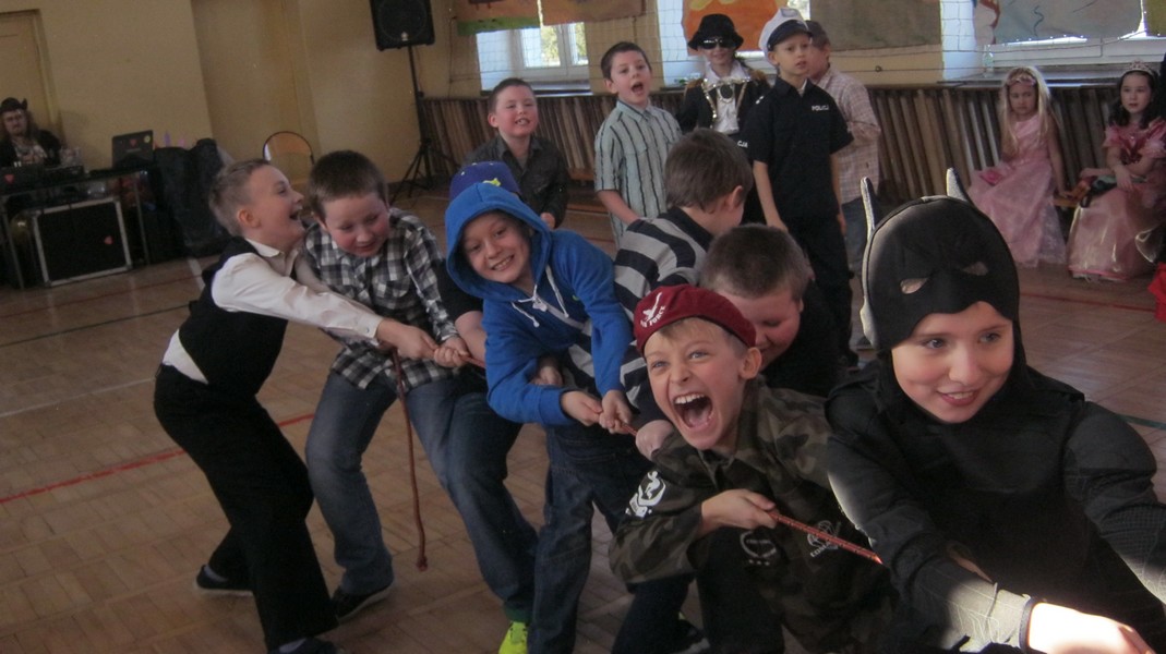 Uczniowie "Małej Jedynki" bawili się na balu karnawałowym. Zabawa odbyła się na sali gimnastycznej, a poprowadzili ją animatorzy Teatru Forma z Białegostoku.