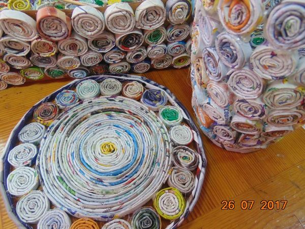 Ze starych gazet i odrobiny kleju powstawały różne przedmioty: podstawki, osłonki na doniczki czy koszyczki.