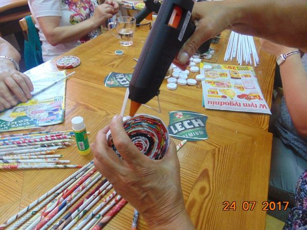 Ze starych gazet i odrobiny kleju powstawały różne przedmioty: podstawki, osłonki na doniczki czy koszyczki.