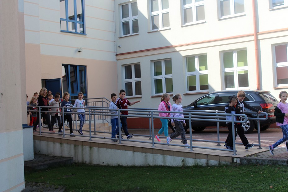 Zadanie próbnej ewakuacji wykonano w dniu 28 września 2017 r. "duża szkoła" i 2 października "mała szkoła". Sygnał do ewakuacji dał alarmowy 3 - krotny dzwonek szkolny o godzinie 12:00.