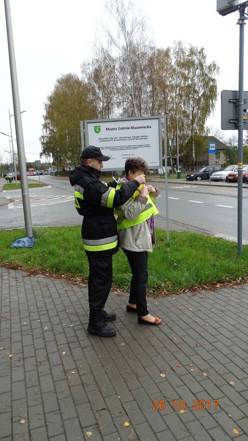 Dzielnicowi, naczelnik wydziału ruchu drogowego, przedstawiciele starostwa powiatowego i straży pożarnej wręczali ostrowianom kamizelki odblaskowe.