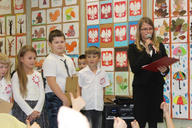 Dnia 9 listopada 2017 r. uczniowie klasy III e pod opieką wychowawczyni Katarzyny Sitek przygotowali apel dla uczniów klas I-III z okazji Narodowego Święta Odzyskania Niepodległości.