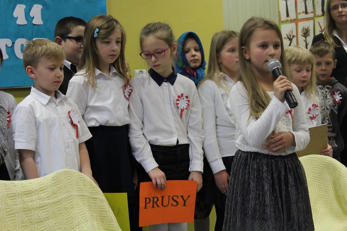 Dnia 9 listopada 2017 r. uczniowie klasy III e pod opieką wychowawczyni Katarzyny Sitek przygotowali apel dla uczniów klas I-III z okazji Narodowego Święta Odzyskania Niepodległości.
