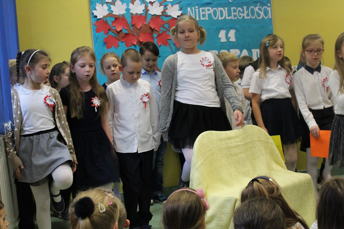 Dnia 9 listopada 2017 r. uczniowie klasy III e pod opieką wychowawczyni Katarzyny Sitek przygotowali apel dla uczniów klas I-III z okazji Narodowego Święta Odzyskania Niepodległości.