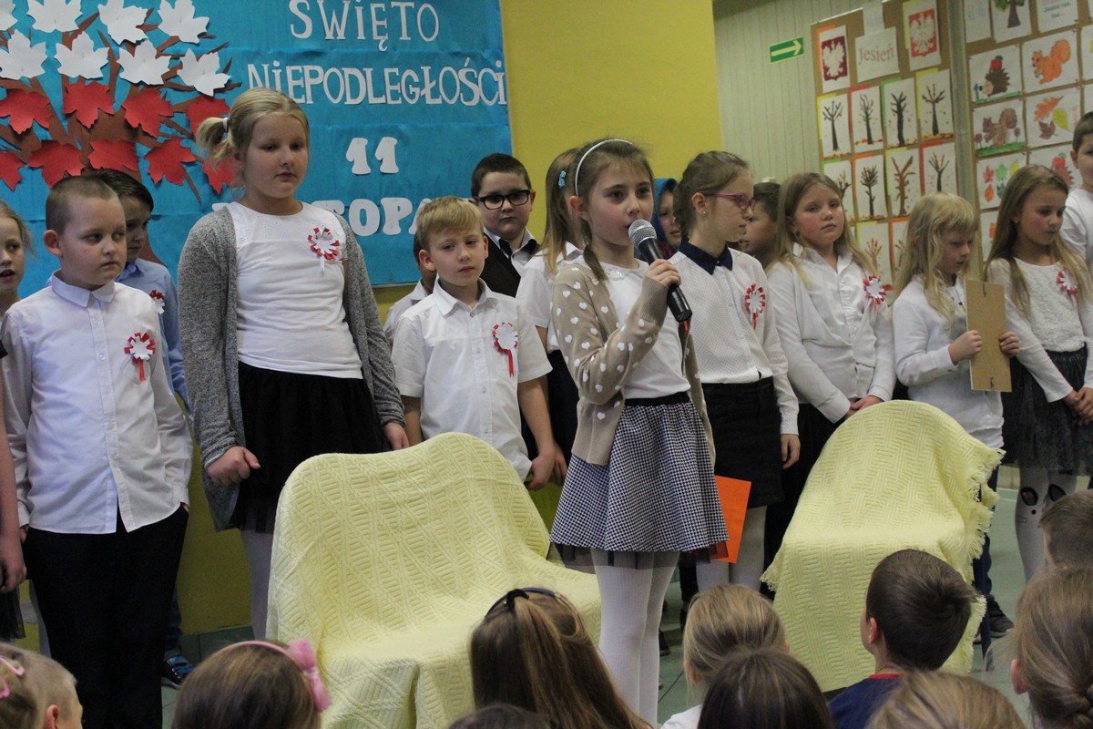 Dnia 9 listopada 2017 r. uczniowie klasy III e pod opieką wychowawczyni Katarzyny Sitek przygotowali apel dla uczniów klas I-III z okazji Narodowego Święta Odzyskania Niepodległości.