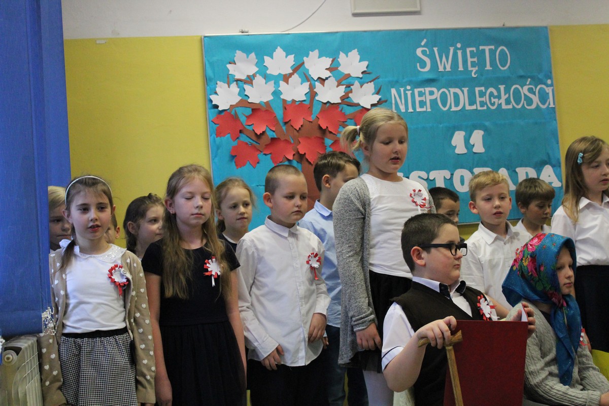 Dnia 9 listopada 2017 r. uczniowie klasy III e pod opieką wychowawczyni Katarzyny Sitek przygotowali apel dla uczniów klas I-III z okazji Narodowego Święta Odzyskania Niepodległości.