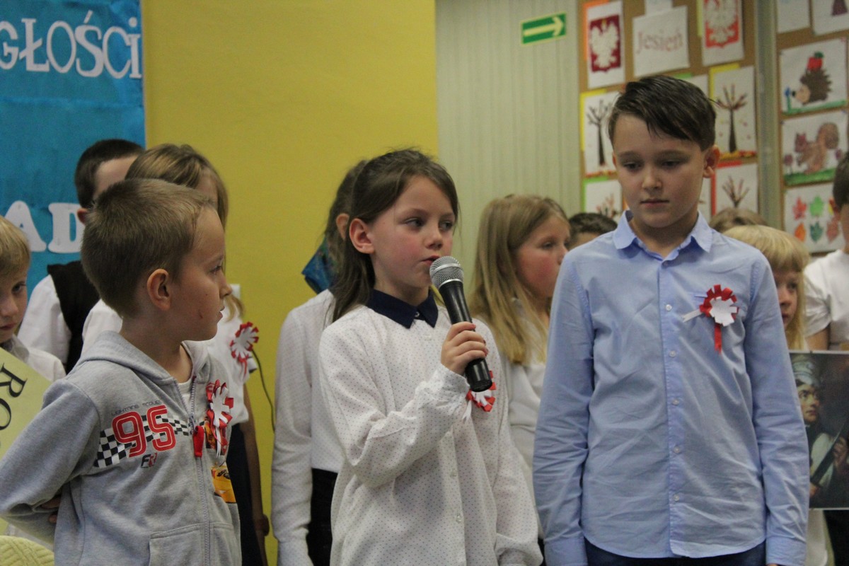 Dnia 9 listopada 2017 r. uczniowie klasy III e pod opieką wychowawczyni Katarzyny Sitek przygotowali apel dla uczniów klas I-III z okazji Narodowego Święta Odzyskania Niepodległości.
