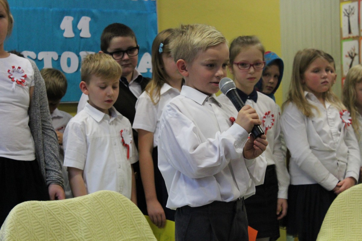 Dnia 9 listopada 2017 r. uczniowie klasy III e pod opieką wychowawczyni Katarzyny Sitek przygotowali apel dla uczniów klas I-III z okazji Narodowego Święta Odzyskania Niepodległości.