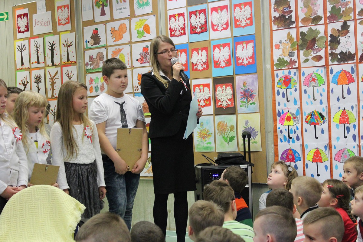 Dnia 9 listopada 2017 r. uczniowie klasy III e pod opieką wychowawczyni Katarzyny Sitek przygotowali apel dla uczniów klas I-III z okazji Narodowego Święta Odzyskania Niepodległości.