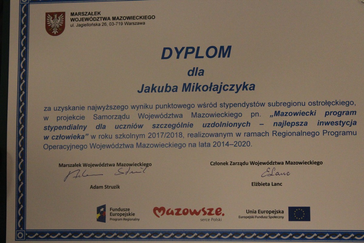 Uczeń Gimnazjum Publicznego Nr 1 wziął z sukcesem po raz drugi udział w programie stypendialnym Marszałka Województwa Mazowieckiego.