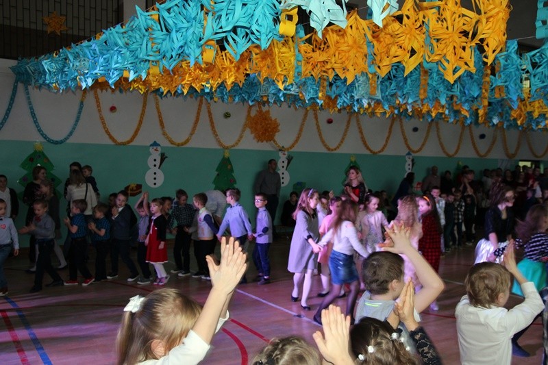 Choinka jak zwykle była wielkim przeżyciem dla najmłodszych uczniów. Wszyscy uczestnicy noworocznej zabawy zabrali ze sobą świetne humory i dali się porwać wesołym rytmom.