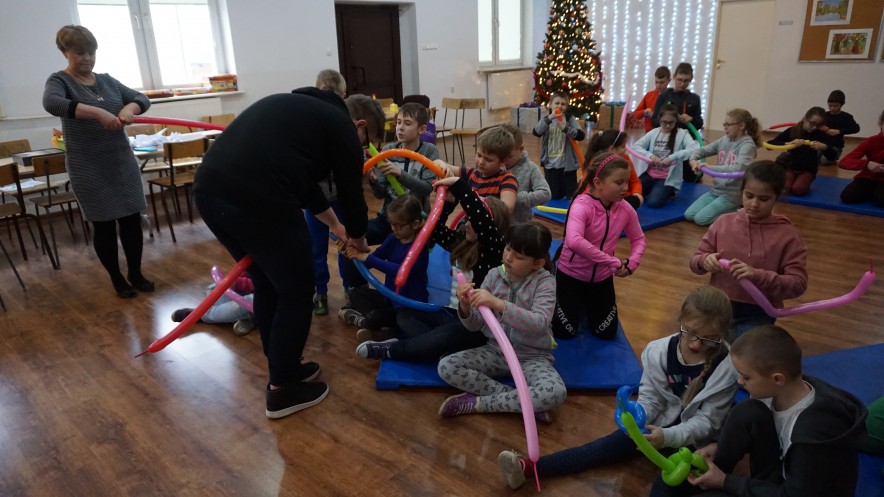 Podczas półkolonii dzieciaki nauczyły się tworzyć balonowe zwierzątka i śnieżynki-wycinanki, a także poznały mnóstwo zabaw sprawnościowych, artystycznych i edukacyjnych, m. in. detektyw, piłka parzy, zabawy z chustą, dmuchanie śnieżynek, zamiana miejsc - ZOO i wiele innych!