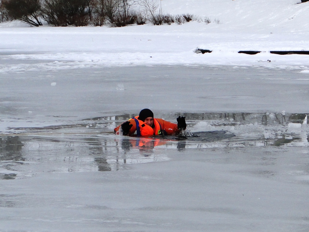 Ratownicy oraz funkcjonariusze policji przedstawili symulacje zdarzenia, podczas którego pod człowiekiem załamuje się lód.