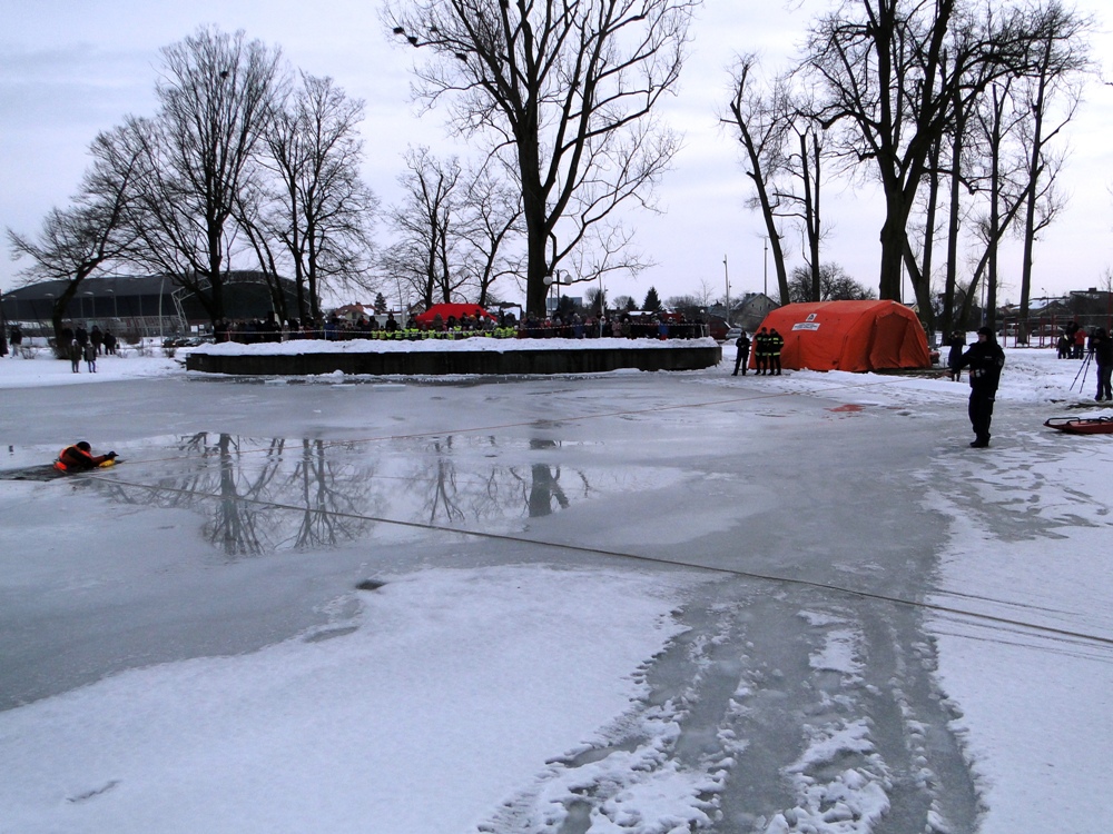 Ratownicy oraz funkcjonariusze policji przedstawili symulacje zdarzenia, podczas którego pod człowiekiem załamuje się lód.