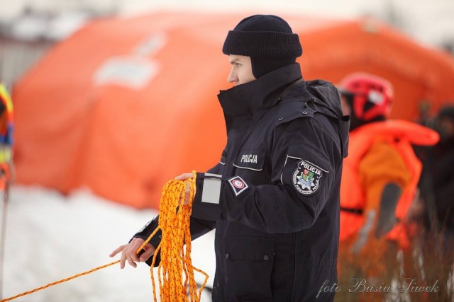 Ratownicy oraz funkcjonariusze policji przedstawili symulacje zdarzenia, podczas którego pod człowiekiem załamuje się lód.