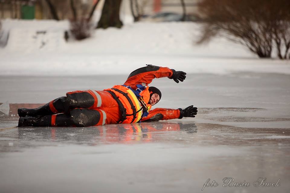 Ratownicy oraz funkcjonariusze policji przedstawili symulacje zdarzenia, podczas którego pod człowiekiem załamuje się lód.