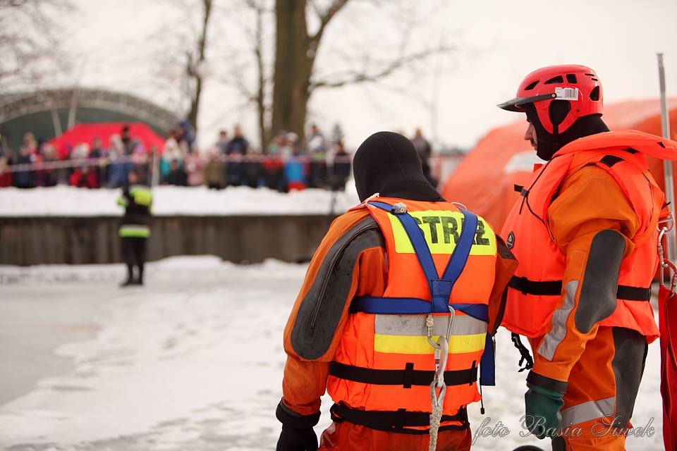 Ratownicy oraz funkcjonariusze policji przedstawili symulacje zdarzenia, podczas którego pod człowiekiem załamuje się lód.