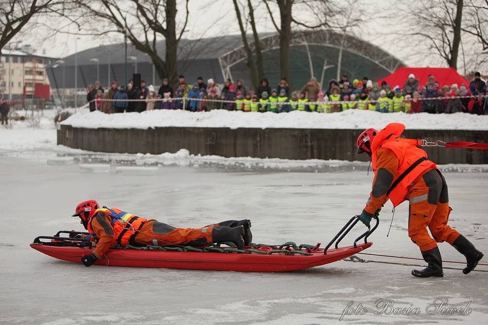 Ratownicy oraz funkcjonariusze policji przedstawili symulacje zdarzenia, podczas którego pod człowiekiem załamuje się lód.