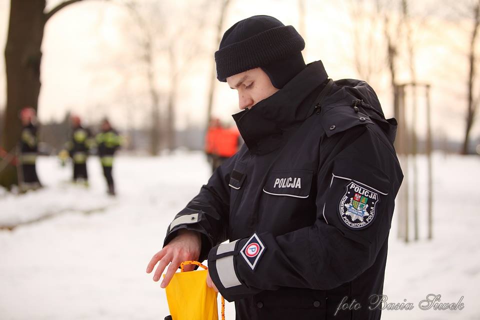 Ratownicy oraz funkcjonariusze policji przedstawili symulacje zdarzenia, podczas którego pod człowiekiem załamuje się lód.