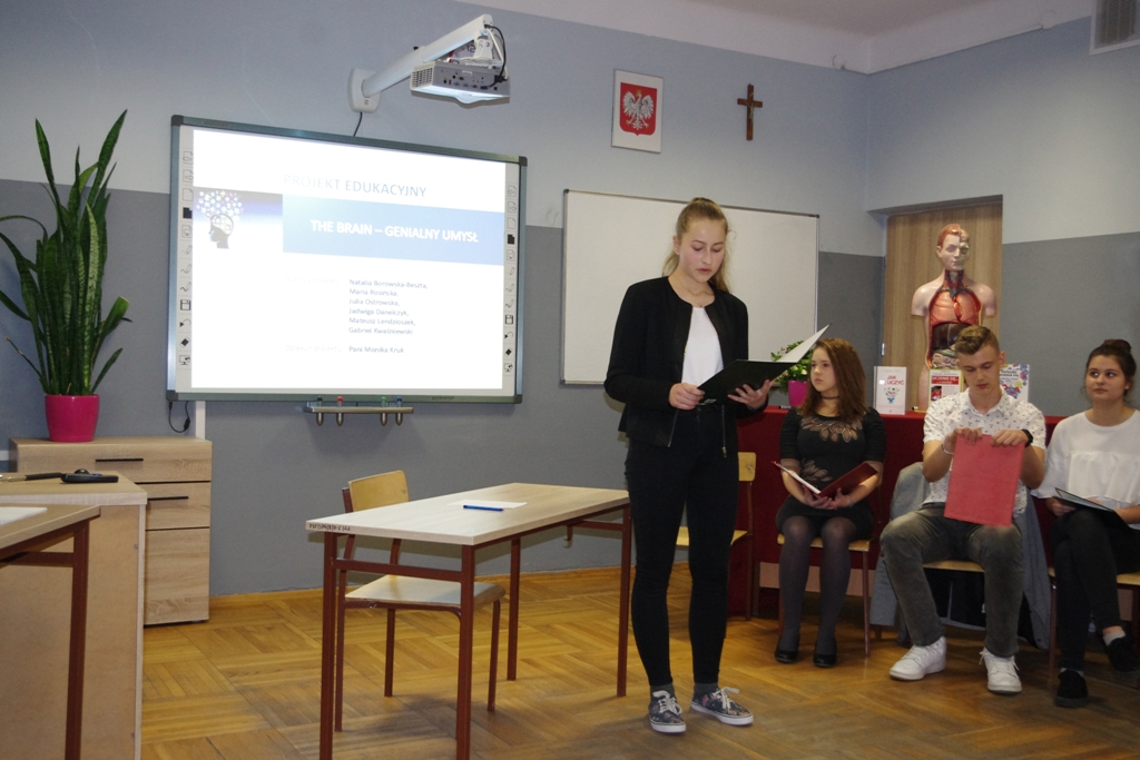 29 stycznia 2018 r. grupa uczniów z klasy II gimnazjum w składzie: Natalia Borowska Beszta, Jadwiga Danelczyk, Maria Rosińska, Julia Ostrowska, Mateusz Lendzioszek i Gabriel Kwaśniewski pod kierunkiem pani Moniki Kruk zaprezentowała swój projekt edukacyjny z biologii zatytułowany "The Brain - genialny umysł".